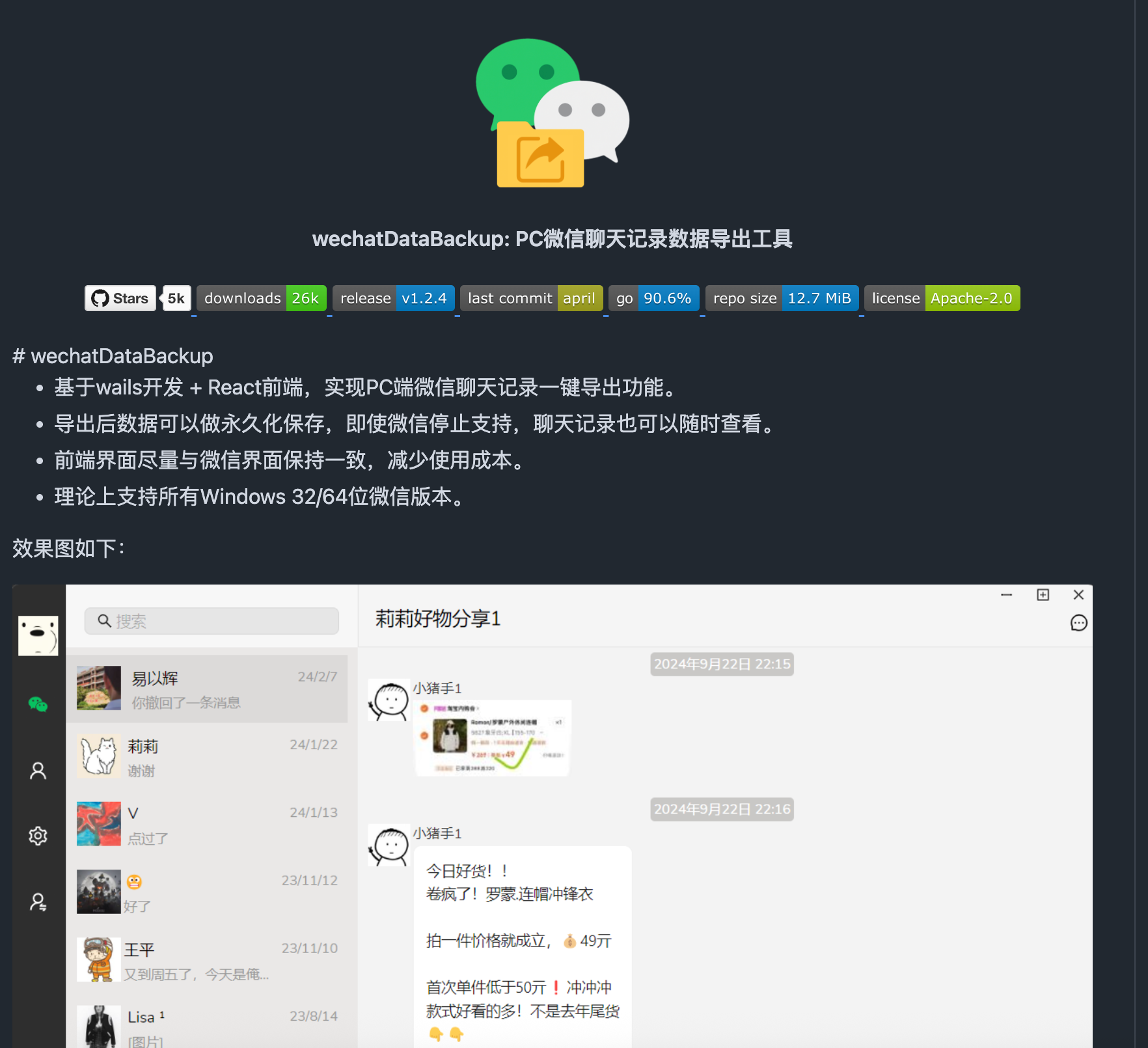 - 基于wails开发 + React前端,实现PC端微信聊天记录一键导出功能。
