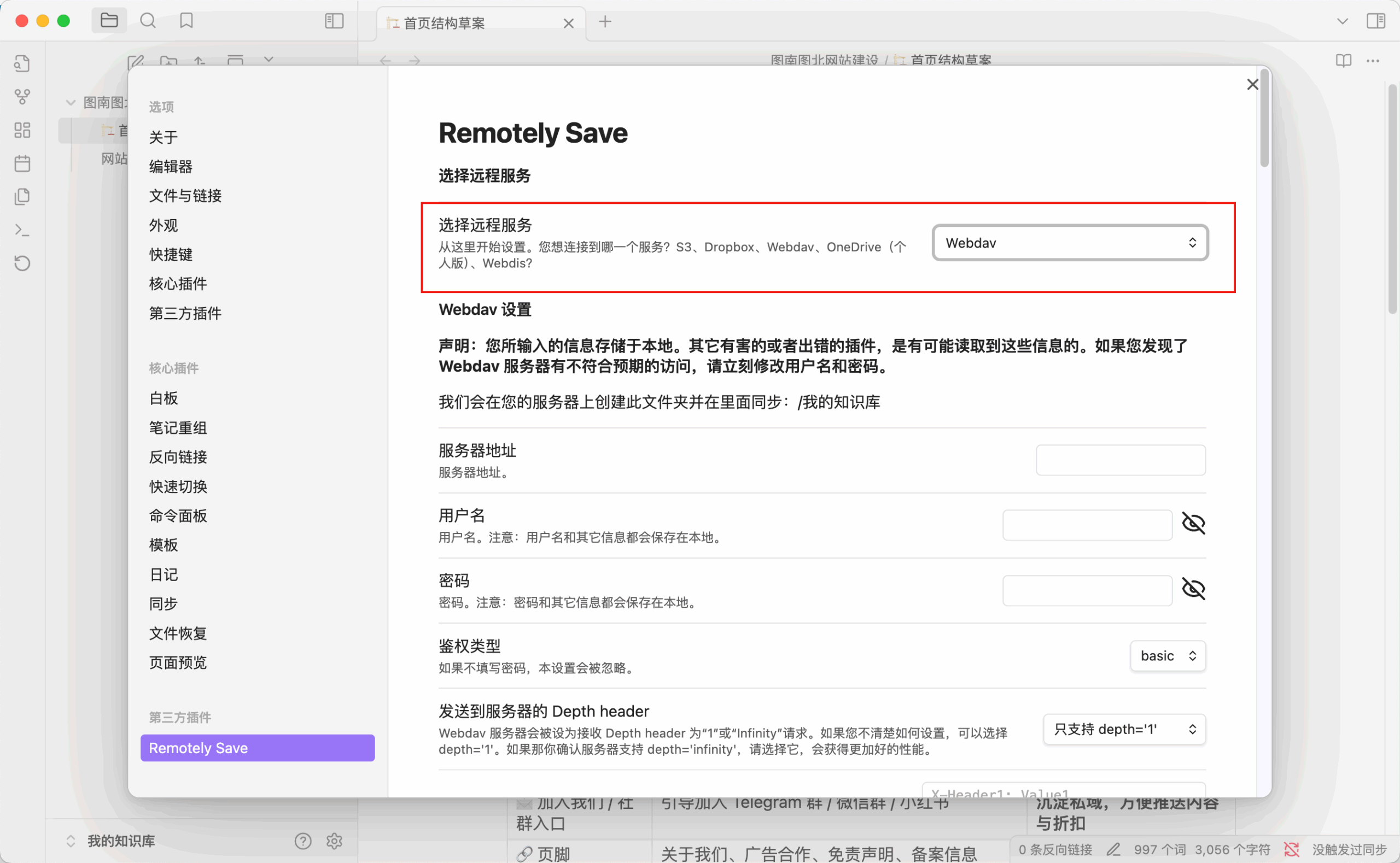 这个插件是支持WebDAV和其他类似S3、OneDrive等多种功能存储方案的,其他大多是网盘嘛,我也没有,所以WebDAV是对我来说目前最完美的同步方案
