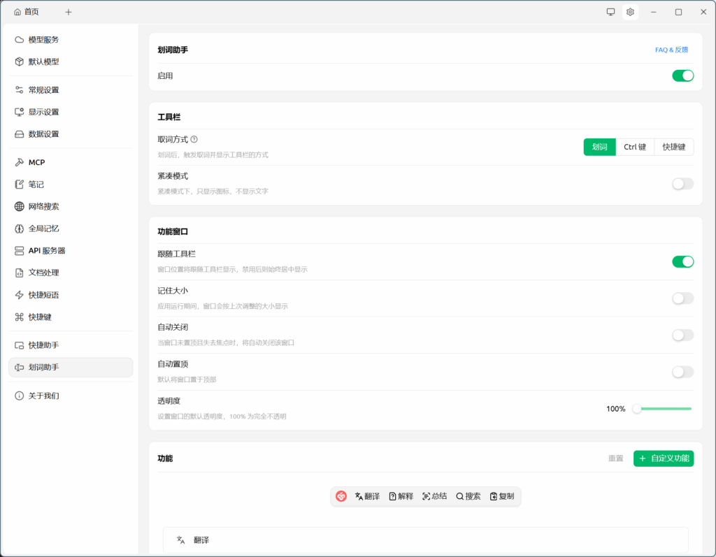4、翻译功能:划词翻译和内容总结这两个功能是我经常使用的功能,之前是依靠豆包来做的,但是我觉得豆包实在是太占内存了,我的电脑资源没有那么多,Cherry Studio就还挺好,占用要相对少一点。