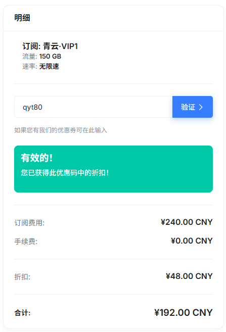 青云·VIP1-年付(年付8折后¥240.00/ 年,再叠加优惠8折折后¥192.00/年,综合6.4折,折后¥16/月)—— 日常需求首选(¥16.0/月150GB IPLC专线流量)日常通勤办公 + 4K 视频都毫无压力
